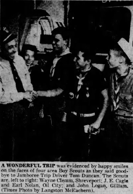 Explorers Lewis Watts, Jr. and Virgil Pittman achieved the Eagle Scout rank. They were members of Post No. 8, sponsored by North Caddo High School; and led by industrial arts teacher Jim Creighton. Both served as junior assistant scoutmasters of Troop 57. Mr. Creighton had taught at Oil City High prior to the opening of North Caddo.